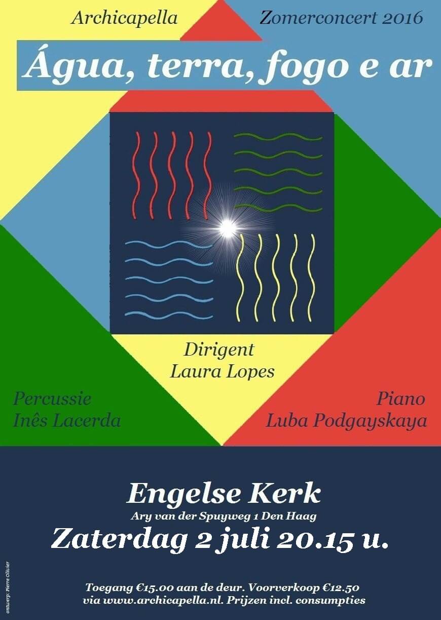Op zaterdag 2 juli 2016 vond het jaarlijkse zomerconcert van Archicapella plaats, getiteld Água, terra, fogo e ar. De elementen water, vuur, lucht en aarde vormden het thema van een avond met muziek uit alle windstreken. Er werden volksliederen gezongen, maar ook werken van o.a. Fauré, Vaughan Williams, Wolf, Carrapatoso, Ticheli en Trénet.