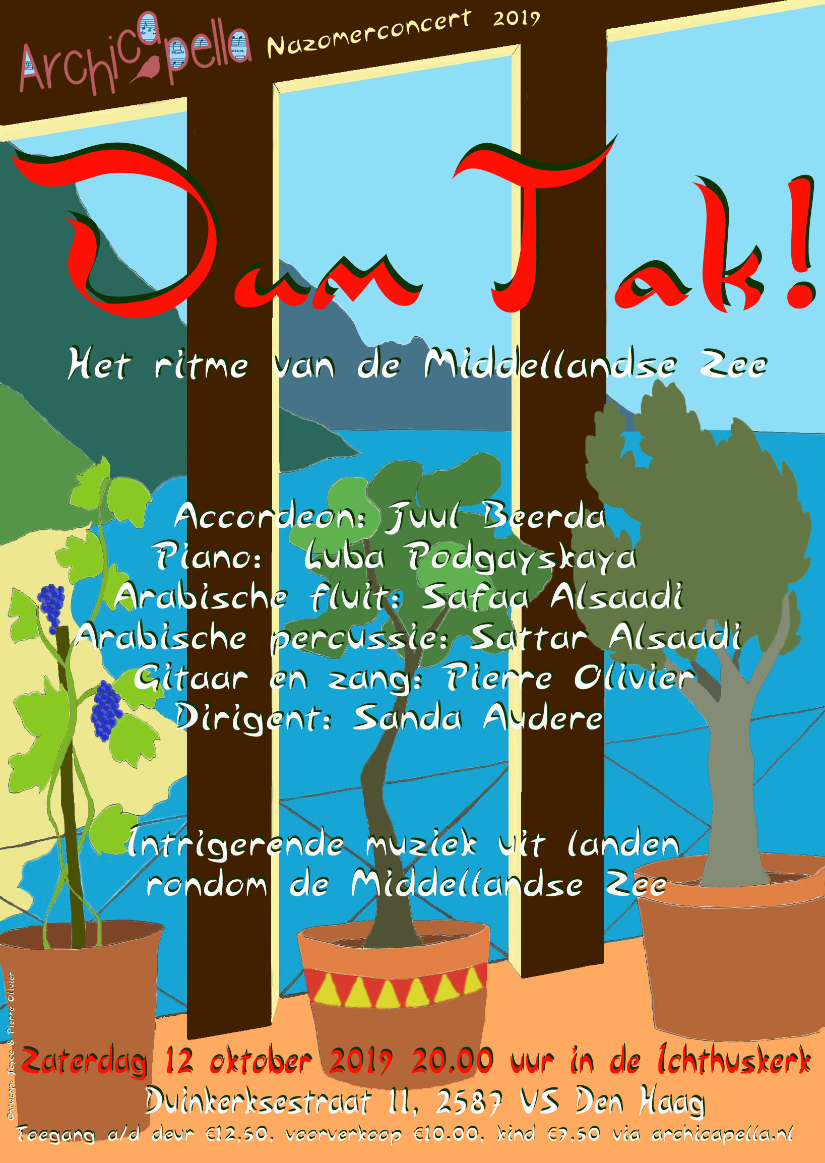 Liederen van landen rondom de Middellandse zee. Niet alleen muziek van Europese origine maar ook uit gebieden ten oosten en ten zuiden van ’s werelds grootste binnenzee. Het werd een muziekfeest van uiterst diverse signatuur: een veeltalige verzameling van intrigerende Romaanse, Slavische, Griekse, Hebreeuwse en Arabische muziek. We werden muzikaal ondersteund door accordeonist Juul Beerda, die tevens wat Franse deuntjes uit z’n instrument toverde. Voor het oosterse gevoel zorgden de heren Alsaadi: Safaa bespeelde de Arabische fluit, de Ney, en Sattar verzorgde de Arabische percussie. Hij bespeelde de Riqq, de Tabla en de Tarr. Verder zong Pierre klassieke Napolitaanse liederen en begeleidde hij zichzelf op gitaar. Met Luba op piano en Sanda als dirigent.