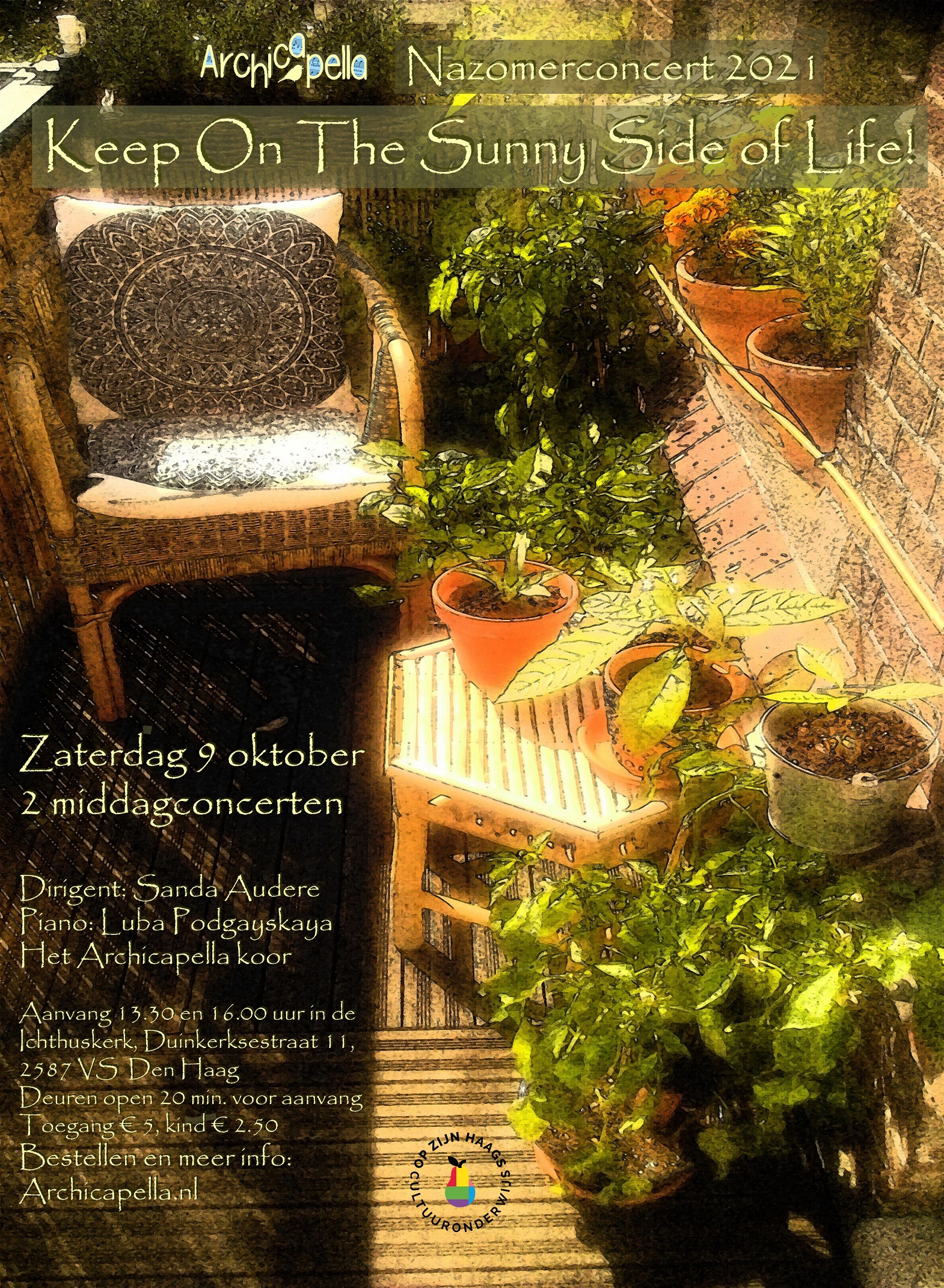 Het eerste concert na de corona uitbraak! Weliswaar hadden we lange tijd niet in gezamenlijkheid kunnen oefenen, maar de repetities hadden geen moment stilgelegen: via zoom lukte het toch om het repertoire op peil te houden. In de donkere periode van de strengste lock-down was besloten een optimistische toon aan te slaan bij het eerstvolgende concert. Vandaar het thema: Keep On The Sunny Side Of Life! We hadden opgewekte, hoopvolle liederen bijeengezocht, die natuurlijk weer uit alle windstreken kwamen.