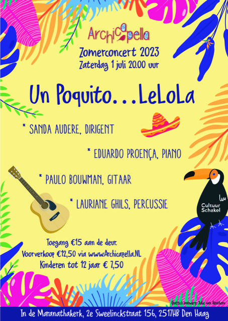 Op 1 juli 2023 was het weer zover: het zomerconcert van het Haagse koor Archicapella. We namen je mee naar Zuid-Amerika en zingen liederen uit onder meer Chili, Argentinië, Venezuela, Brazilië en Cuba. Van swingende ritmes tot zoete melancholie. Over het leven, de dood en bovenal: de liefde!